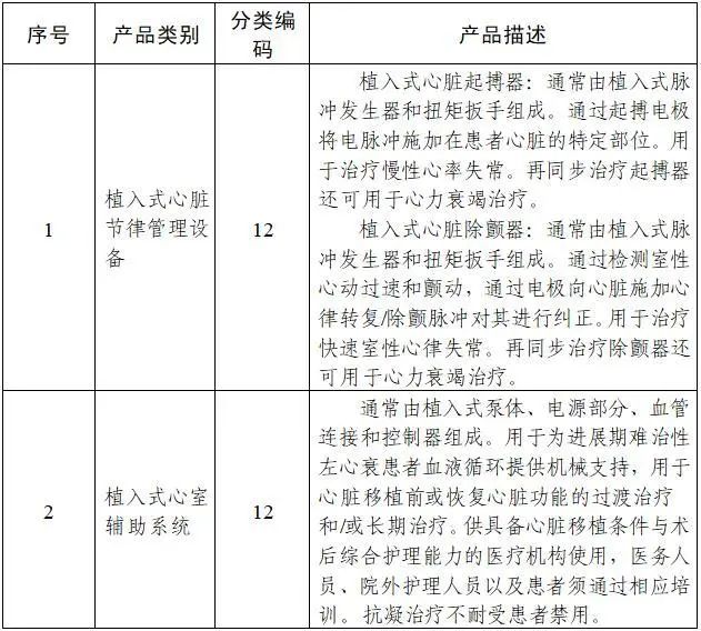 二、调整部分产品类别和描述。将“植入式心脏起搏器、植入式心脏除颤器、植入式心脏再同步复律除颤器”调整为“植入式心脏节律管理设备”,“植入式血泵”调整为“植入式心室辅助系统”,“植入式药物灌注泵”调整为“植入式药物输注设备”,“境内市场上尚未出现的血管内支架系统”调整为“人工心脏瓣膜和血管内支架”;将“境内市场上尚未出现的植入性人工器官、接触式人工器官、骨科内固定产品及骨科填充材料”调整为“含活细胞的组织工程医疗产品”;将“可吸收四肢长骨内固定产品”调整为“可吸收四肢长骨内固定植入器械”。相应的产品描述也进行了细化和明确。