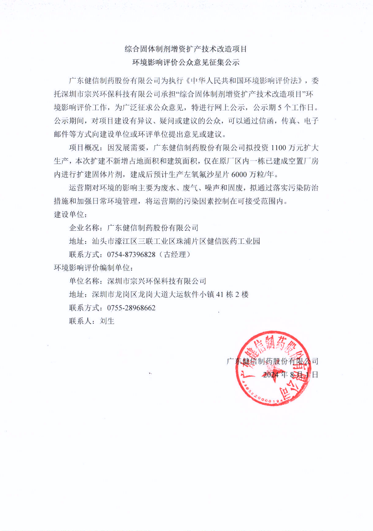 综合固体制剂增资扩产技术改造项目 环境影响评价公众意见