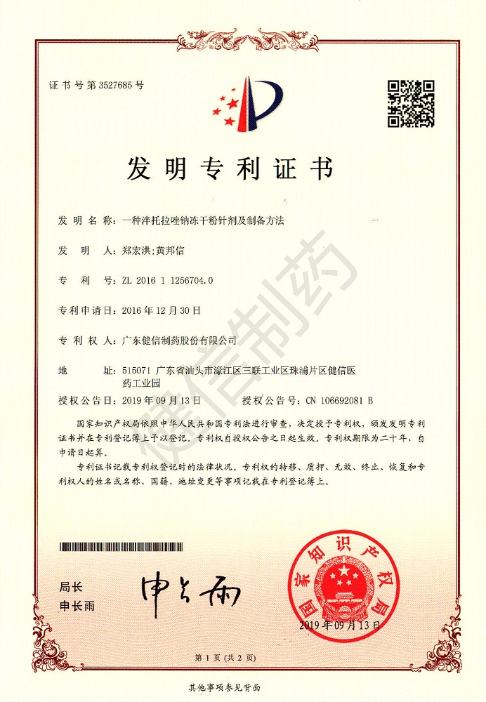 热烈祝贺我公司《一种泮托拉唑钠冻干粉针剂及制备方法》发明专利获得国家知识产权局授权,并于2019年09月13日获得发明专利证书。